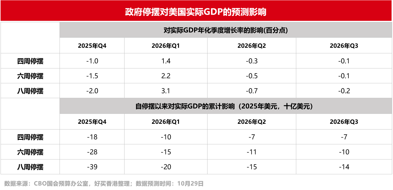 隨著“停擺”時間拉長,除了會影響到民生領(lǐng)域(食品救濟、醫(yī)保福利、民航交通等),對美國的宏觀經(jīng)濟也會造成一定影響。據(jù)美國國會預算辦公室(CBO)報告顯示,預計今年四季度美國實際GDP的年增長率將下降一至兩個百分點。