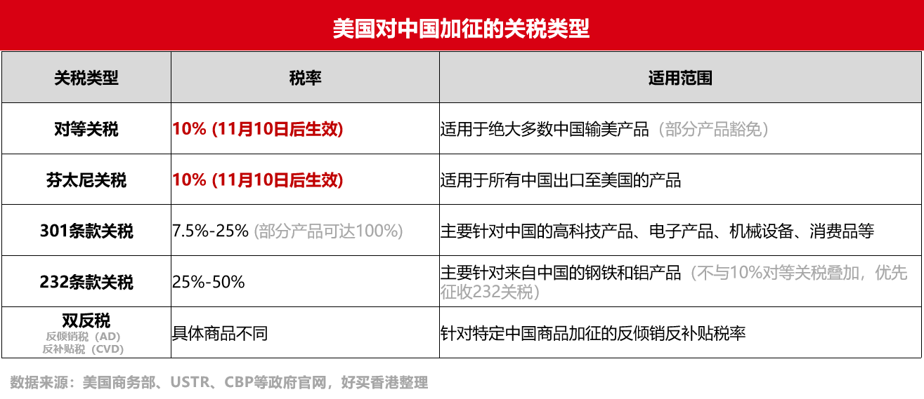 美國對中國加征的關(guān)稅包括:對等關(guān)稅、芬太尼關(guān)稅、301條款關(guān)稅、232條款關(guān)稅、反傾銷和反補貼稅。其中“對等關(guān)稅”和“芬太尼關(guān)稅”的稅率將在11月10日后降至10%。目前,中國是被加征對等關(guān)稅稅率最低的國家之一。